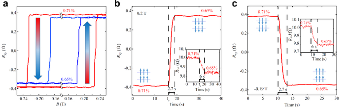 图4.(a)利用应变下矫顽场的改变,可实现应变辅助的磁翻转;(b-c)在应变辅助下,分别实现磁矩从"上"往"下"和从"下"往"上"的翻转。