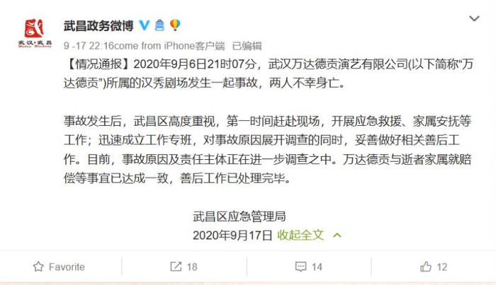 9月17日晚,武汉市武昌区官方微博发布通报称,9月6日21时07分,武汉万达德贡演艺有限公司所属的汉秀剧场发生一起事故,两人不幸身亡。目前,事故原因及责任主体正在进一步调查之中。万达德贡公司与逝者家属就赔偿等事宜已达成一致,善后工作已处理完毕。