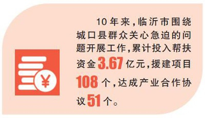 10年来,临沂市围绕城口县群众最关心、最急迫的问题开展工作,依托自身优势,积极开拓扶贫协作渠道,用真心、真情、真策给城口县群众送去了看得见、摸得着的实惠,累计投入帮扶资金3.67亿元,援建项目108个,达成产业合作协议51个,协议金额达27.78亿元,组织购买重庆及城口县农特产品1.49亿元,选派干部人才219人到城口县开展智力帮扶,培训实用技术型人才4100多人。