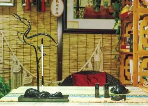 以“白鹤梁”为主题设计,包括“鹤舞”笔架、“鱼出”笔搁、静心桌、“碑文”砚台和“鱼莲”石墨等。