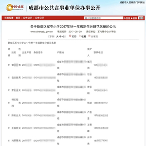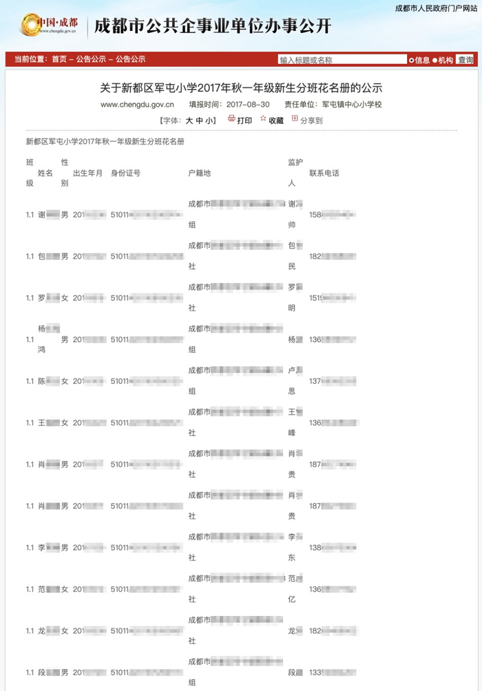 近日,有网友向澎湃新闻反映称,四川省成都市人民政府官网公布的《关于新都区军屯小学2017年秋一年级新生分班花名册的公示》存在泄露公民个人隐私信息的情况。