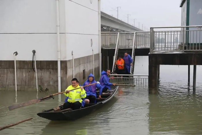 洪水来袭,上海集团公司职工利用橡皮艇和小木船第一时间将价值约300万元的设备器材安全转移。