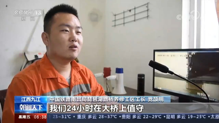 南昌局集团公司九江桥工段琵琶湖路桥养修工区职工,顶着七级大风,在九景衢铁路鄱阳湖特大桥上实时盯控洪水情况。
