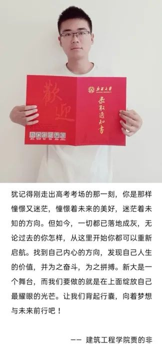 2020年8月20日,这份“沉甸甸”的生日礼物准时收到,我正式成为一名新大人啦!拿到录取通知书时的那份期待和感动,至今仍记忆犹新。六个月的努力,不被辜负,倍感欣慰,录取通知书不仅是一个诚挚的邀约,更是“听从你心,无问西东”的梦想,未来三年,不辜负,不被辜负。新大、新大人一起加油呐!