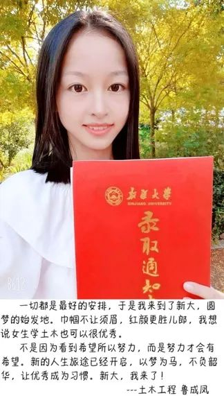 鲜红的新大录取通知书,把我的心带到了梦开始的地方。天山、雪莲、戈壁、牧场,富饶的塔里木,神秘的楼兰遗迹,都令我向往。新大,我将在你的怀抱里开启我人生新的航程,我一定会充分发掘自身潜力,努力学习专业知识,同时加强交际、思辨等能力的培养,积极参加学校的各项活动,让四年的黄金时光,成为自己人生的加油站,将自己打造成对国家、社会有用的人,让我的大学生活不留遗憾。