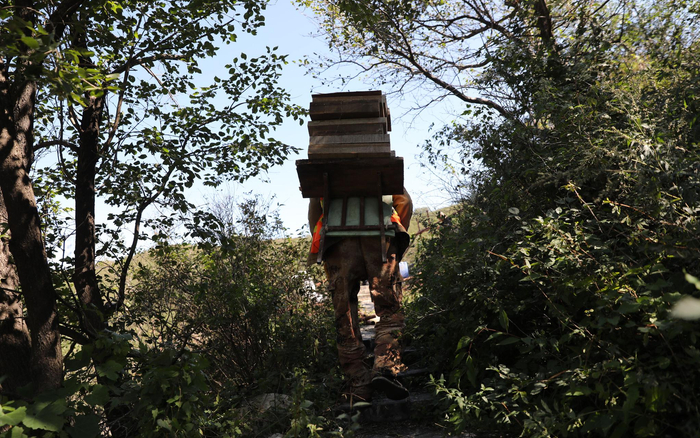 工人将修缮中需使用的木材辅料背上长城。摄影/新京报记者 王远征