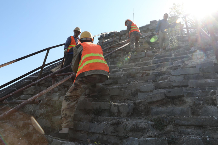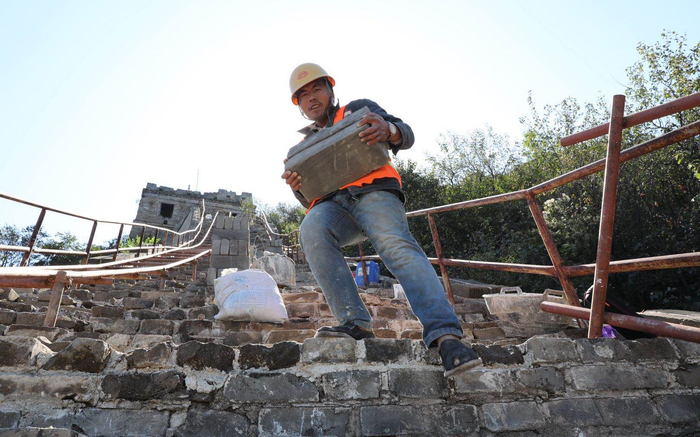 他们在古长城“修墙”:背驮60斤砖块,走“之”形路线上敌楼