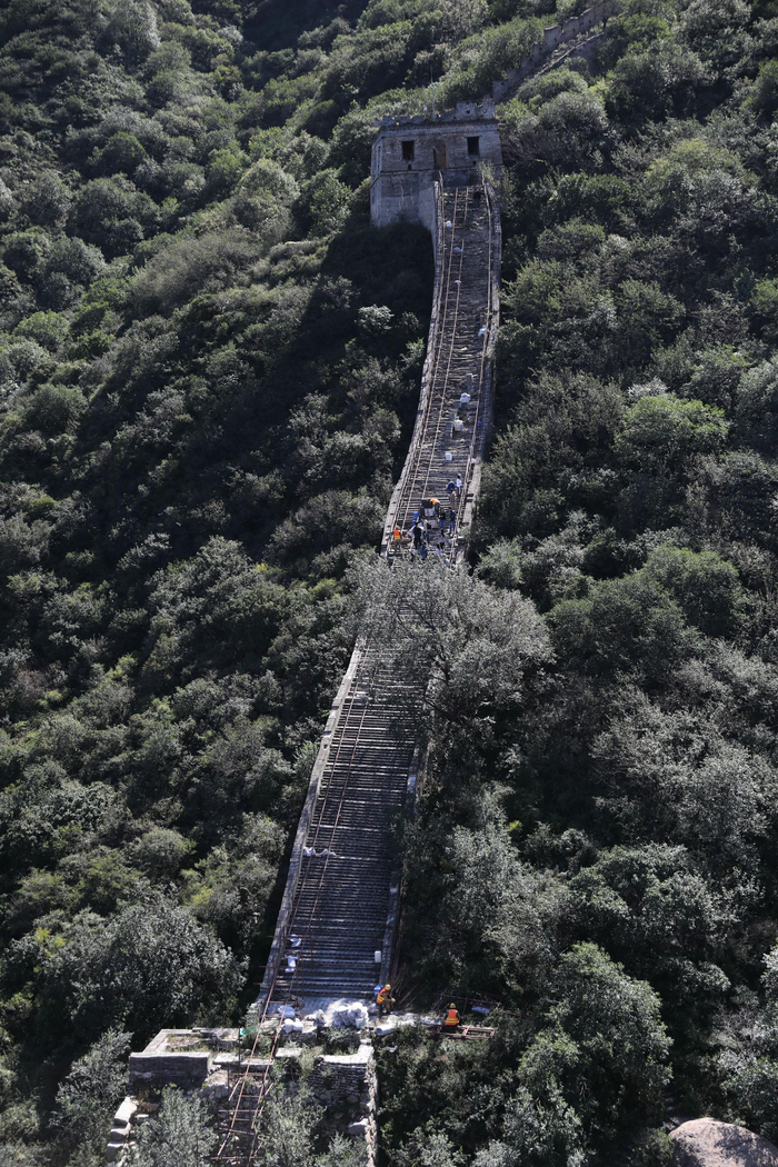 原标题:他们在古长城“修墙”:背驮60斤砖块,走“之”形路线上敌楼