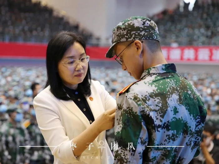 (校党委书记庄天慧为新生佩戴校徽)