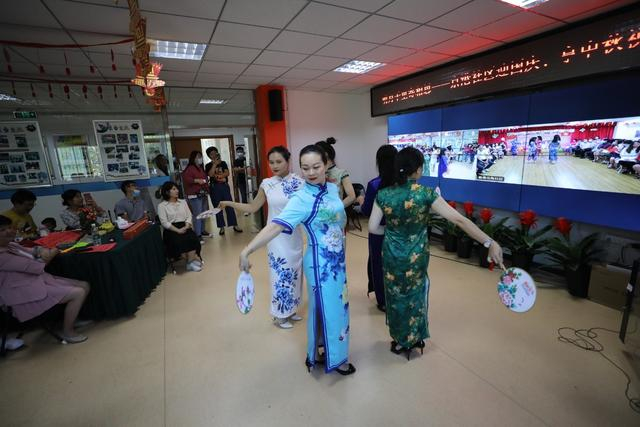 两地旗袍队在各自现场表演了旗袍秀,动作、音乐完全一致,可见演员们私下没少合练,优雅的旗袍表演,引得现场居民纷纷举起手机拍照。