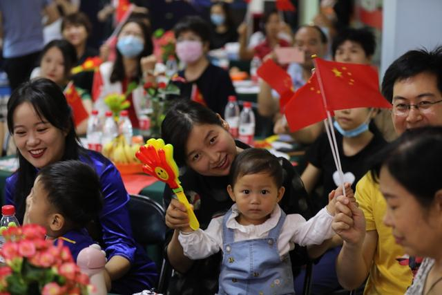 19日上午,东里南社区服务站里热闹非常,会场的桌子上摆着月饼、老婆饼、蛋黄卷等小吃,香蕉、桔子等水果,居民们手里挥舞着小国旗、看着大屏幕,跟远在香港的居民视频连线互动。视频画面中,香港现场也布置得喜气洋洋,阿姨们穿着旗袍,有的小伙子穿着西装,很是正式。