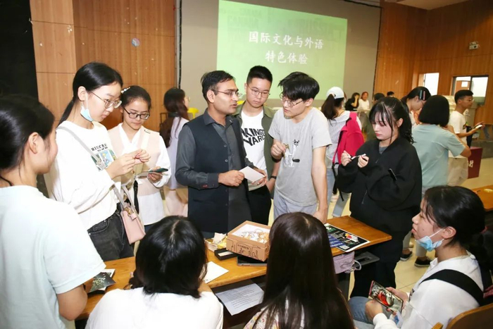 国际文化特色体验活动分为国际文化展、语言文字秀及未来祝福墙三部分,吸引了许多同学冒雨前来参加。活动负责人英语1802班的陈子瑶表示,活动都是由同学们自主策划,为了吸引新生们积极参与也是费了一番脑筋,“活动的灵感创意都是来自专业学习的亮点和趣味点,我们想通过这种方式,让同学们体验各国文化的魅力,感受到学习英语的乐趣。”(侯国涛 摄)
