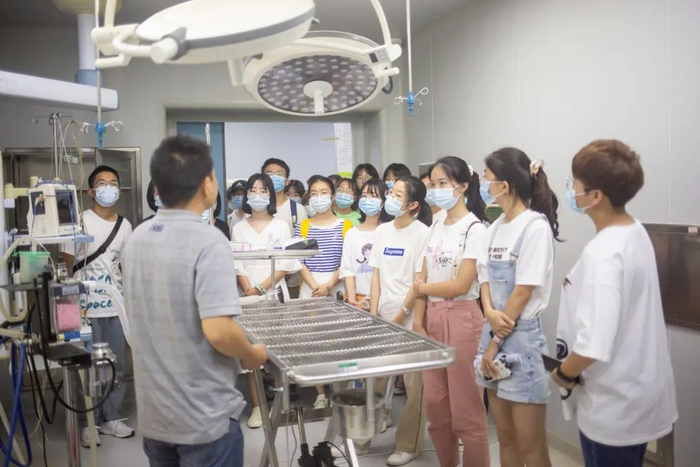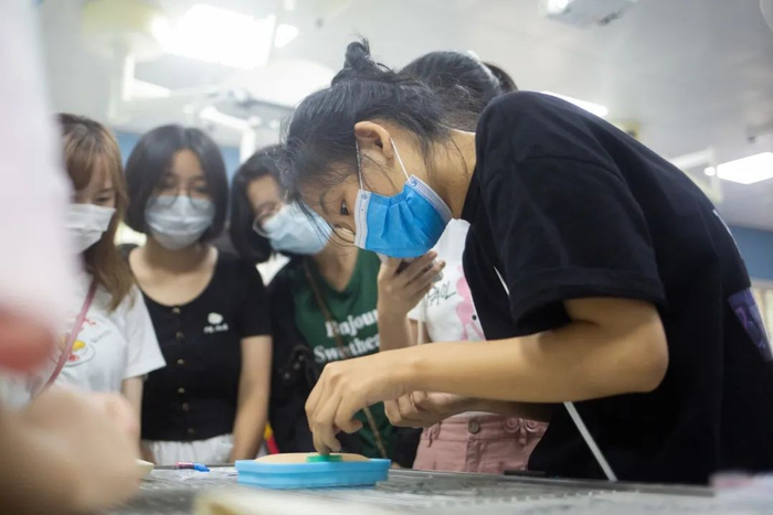在动物医院举行的“守护生命:宠物医生的一天”活动上,60名动科动医学院新生在老师和高年级同学带领下,参观动物医院的大厅、诊室、手术室、CT室以及康复中心,体验宠物医生的一天。一个合格的动物医生不仅需要掌握专业理论知识,还需要有过硬的实际操作能力,因此活动还安排了新生体验“缝皮”。动医1605班的吴诗剑和动医1701班的滕雨萌指导新生进行简单的缝皮。“动物皮肤”的伤口缝合需要用到的手术镊,持针钳、手术剪等工具,缝皮材料是硅胶材质,与动物皮肤触感相似。“镊子要垂直,夹紧皮肤切口”,同学们自己上手的时候,吴诗剑在一旁提醒。动医专业的新生林晨觉得自己“手笨”,但她相信在学习专业课之后,她一定会做得比学长学姐还好。(李靖威 摄)