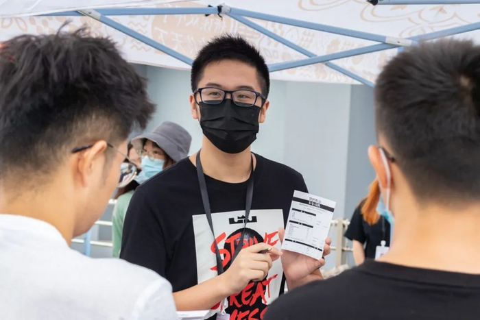 “应用化学学科体验:从微观物质可视化看新冠病毒核酸检测”活动中,新生们在志愿者的指导下参与“指纹识别”体验活动。同学们将手指按压过的滤纸与碘单质粉末接触后,滤纸上会显现出淡黄色的指纹印。据理学院成万民老师介绍,易挥发的碘单质会吸附在手指上的分泌的油脂上,正是通过这一原理,实现了指纹拓印。(卢逸轩 摄)
