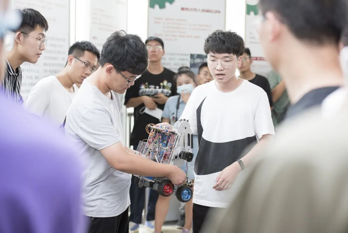 移动起来发出齿轮的摩擦声,却能在曲折的的“田间”路上顺利走完全程,这是工学院学生制作的智慧除草小车的独特“本领”。由工学院承办的的“智能小车竞赛”活动,以观摩并介绍智慧小车模型为主要内容,以激发学生的创新创业能力为主旨,带领新生走进工科世界。工学院卫佳老师表示,这项活动主要目的就是激发学生的兴趣,让同学们有创新科技的意识:“智能小车的制作属于多学科交叉,有机械、控制、电路、程序、农业等学科的结合。所以设计这类活动是希望同学们能通过团队合作加强综合应用的能力,这也是与农业相结合,体现了工科在智慧农业中的重要作用。”(刘涛 摄)