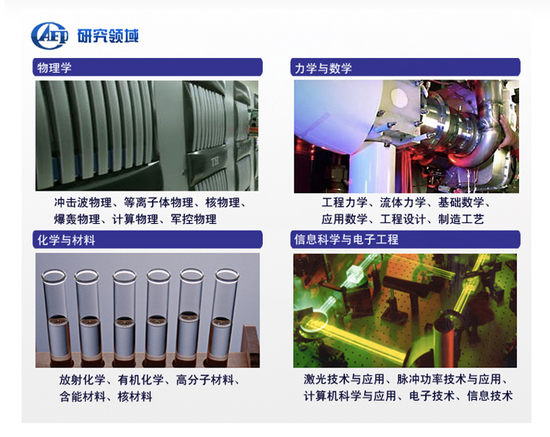 研究领域包括物理学、力学与数学、化学与材料、信息科学与电子工程等,物理学领域,包括冲击波物理、等离子体物理、核物理、爆轰物理、计算物理、军控物理等。