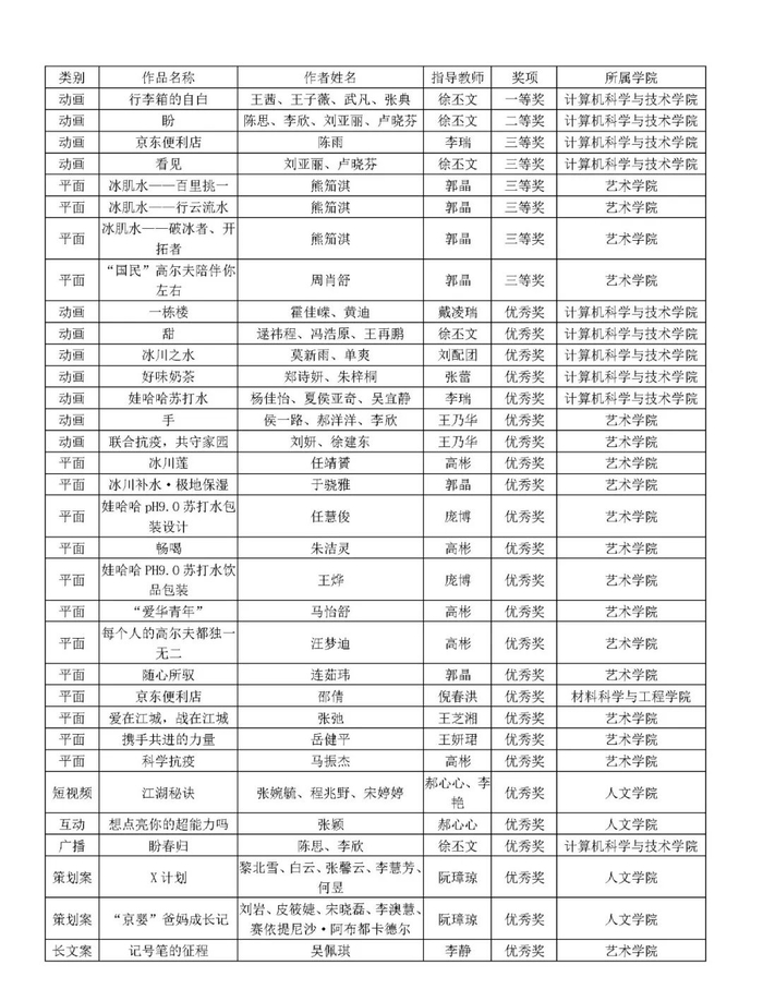 2020年9月15日,第十二届全国大学生广告艺术大赛全国总决赛获奖名单公布,我校参赛团队喜获全国一等奖1项、二等奖1项、三等奖6项、优秀奖25项。我校获奖作品涵盖了平面、动画、短视频、互动设计、广播、策划案、文案等类别,是近年来我校参赛获得奖项最多的一届,其中我校动画类的获奖数量在全国高校中位居第一。计算机科学与技术学院动画专业王茜、王子薇、武凡、张典等同学创作的《行李箱的自白》,获得动画类全国一等奖,这也是天津市高校在本届大赛中获得的唯一的全国一等奖。