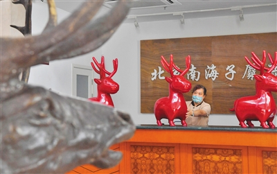 昨日,大兴麋鹿苑,工作人员在摆放“紫禁瑞鹿”文创产品模型。新京报记者 李木易 摄