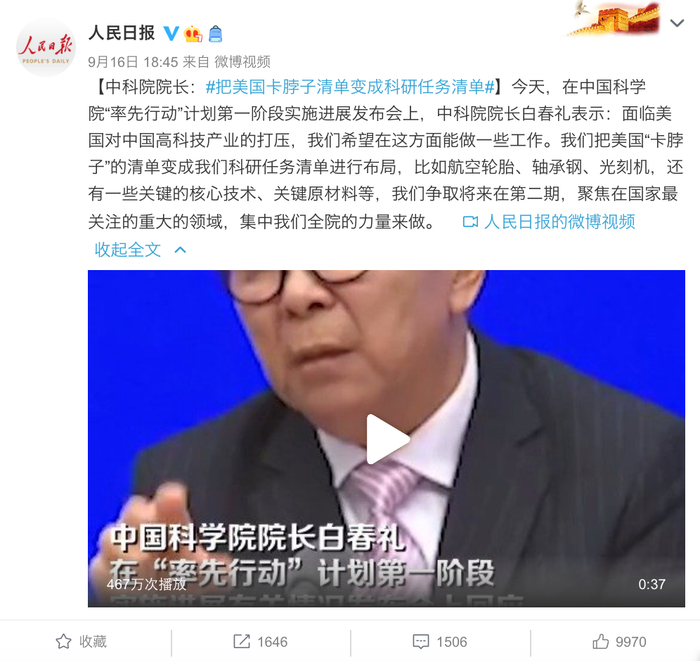 就在任正非到访前一天,9月16日,国新办就中国科学院“率先行动”计划第一阶段实施进展情况举行发布会。会上,中国科学院院长白春礼表示,中科院作为一个科研机构,不能包打天下,还是要聚焦关键的核心技术,有效解决一批“卡脖子”问题。