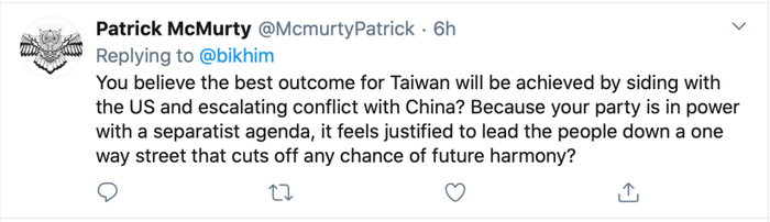 也有网友质问萧美琴:“你认为台湾最好的出路,就是支持美国,并升级与大陆的冲突?就因为你的政党在掌权时奉行分裂主义的议程,你就觉得有理由把台湾带到一条断送未来幸福的单行道上去吗?”