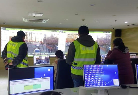 救援队在查看老人走丢地点的监控录像。受访者供图