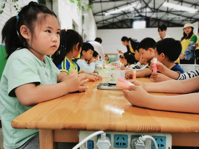 在亲子体验活动中,孩子们体验制作蜂蜜唇膏