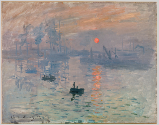 《日出·印象》创作于1872年。当时莫奈随经商的父亲生活在法国的港口城市勒阿弗尔。画作展现的就是莫奈在港口等待黎明破晓之时见到的场景。这幅作品的笔触随性,并前所未有地记录了冒着浓烟的现代工厂和发亮的橙色太阳。莫奈将其随口命名为“印象”。