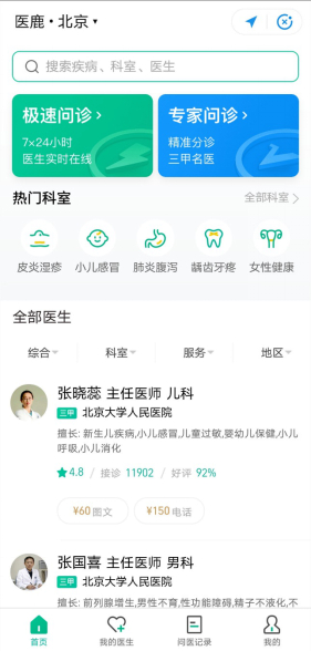 目前,医鹿聚合了6万名专业医生,囊括全国各个领域的权威专家,几乎覆盖主流三甲医院的所有科室,以及免疫规划中心等一些特色科室。医鹿的智能分诊功能,则向用户提供7*24小时实时在线的极速问诊服务。此外,医鹿的挂号功已经覆盖全国主要城市的医院在线预约挂号;药品闪送功能主打北上广深杭等城市24小时30分钟急送药上门服务;体检、疫苗预约能够实现正品疫苗、全国体检在线预约。