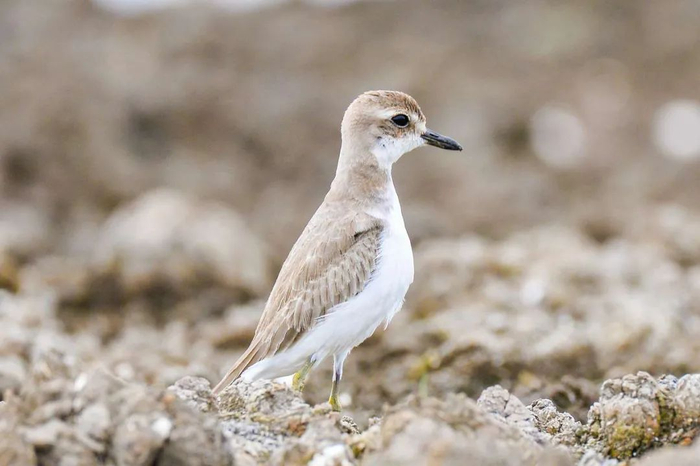 蒙古沙鸻为小型涉禽,体长18~20cm。上体灰褐色。嘴粗短,黑色。脚暗绿色。夏季雄鸟颊和喉白色;额有黑带;胸和颈棕红色,颏、喉白色,其后有一黑色细线,介于胸的棕红色之间。其余下体白色。