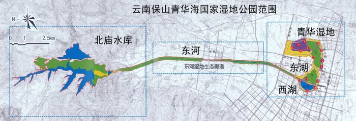 保山青华海国家湿地公园范围包括北庙水库片区、东河片区和青华海片区。青华海片区包括东湖、西湖和青华湿地。