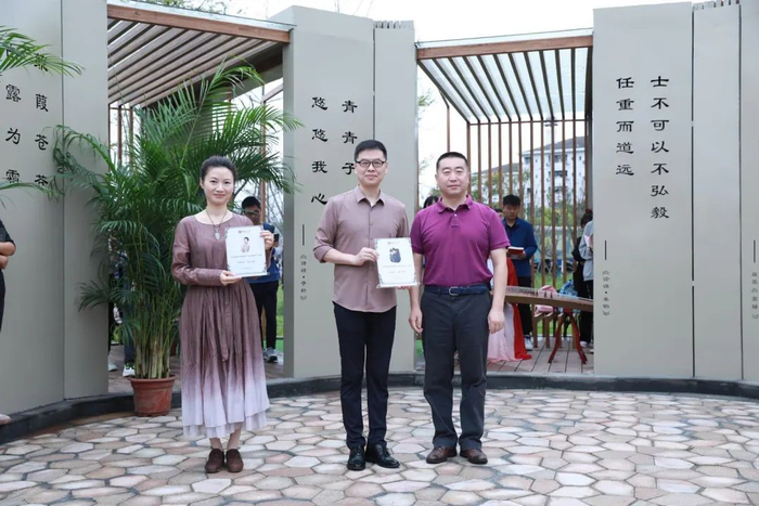 望着眼前碧波盈盈的玉带河,他们自扇形先秦与汉廊亭依次移步至魏晋廊亭、南北朝廊亭、唐代廊亭和宋代廊亭,欣赏着廊亭内镌刻着来自不同朝代的经典词句,每至一个廊亭,杨雨教授为大家诵读一段经典,学生跟读,郦波老师进行释义。