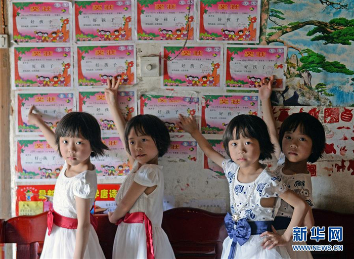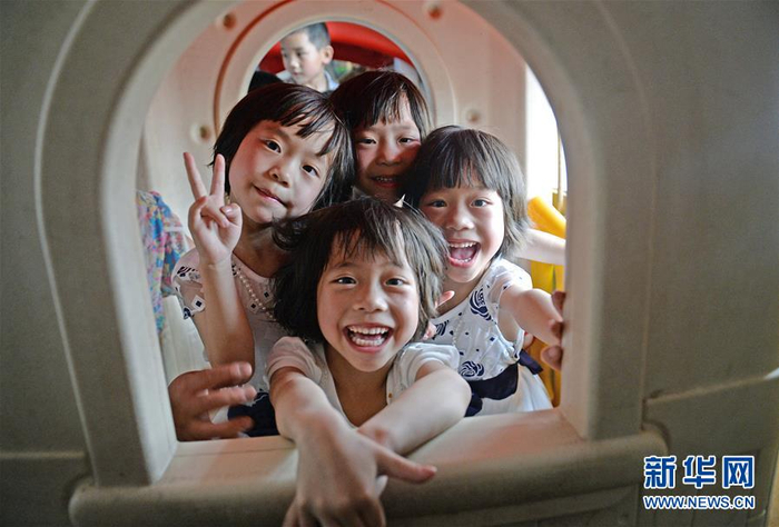 四胞胎姐妹在幼儿园里玩耍,该幼儿园为她们减免了一半学费(2016年5月25日摄)。新华社记者 万象 摄