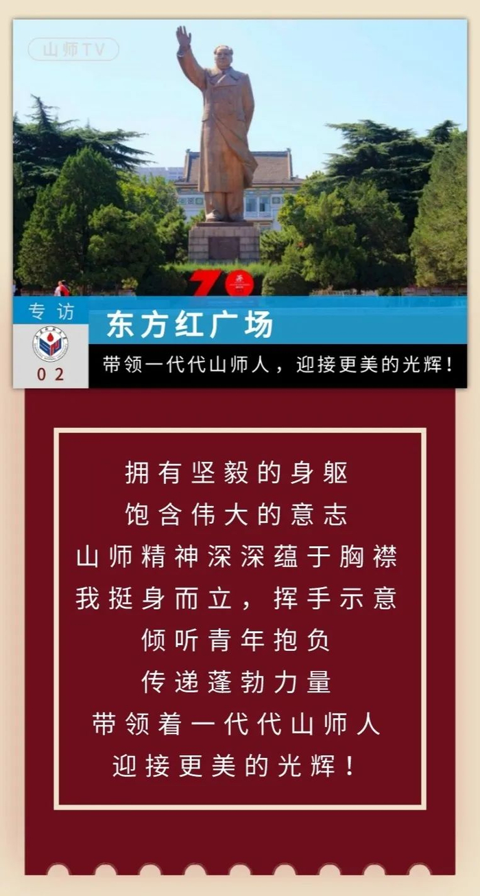 千佛山校区的东方红广场,是学校独特的标志性坐标。位于广场中央的毛主席塑像,姿态伟岸,形象庄严。主席像两侧,松树傲然挺立,箭指凌云。广场庄重典雅,和谐大方,巧妙结合传统理念和现代构思。