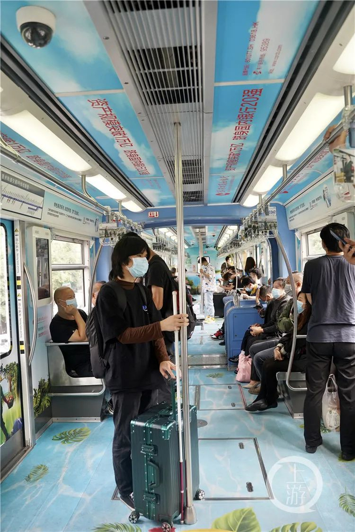 盲杖起了很大的作用,在穿梭的人流中他探索着脚下的路,慢慢走着,一步步走得很稳。进了轨道交通站,工作人员立刻帮他为行李做安检,送他上了2号线车厢,到了牛角沱换乘3号线,再到重庆北站南广场换乘10号线,一路上都有工作人员指引和搀扶。