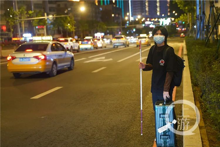到了目的地,出租车司机确定他没有问题后才离开。空旷的街道上行人寥寥,拖着大行李箱,带着盲杖的邬舜仙,似乎不知道往哪里走,天空又开始飘起雨。