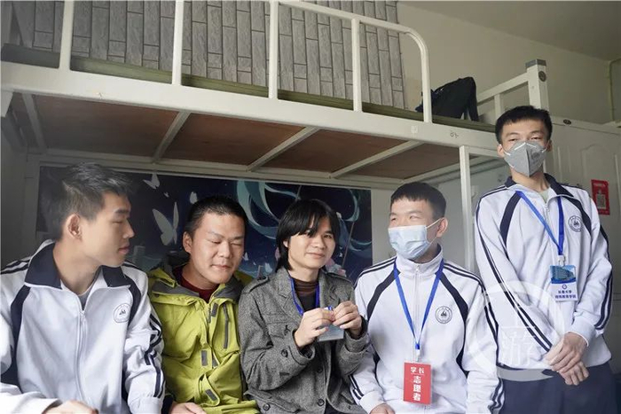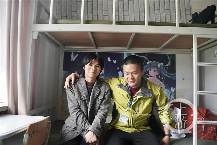 甘宇驰也是重庆市特殊教育中心的优秀毕业生,高考考了全校第一。他俩的家都在重庆开州,还是同一条街道,认识九年了。甘宇驰特意选了邬舜仙的下铺。两个小伙伴互相轻轻拍打着对方,开着玩笑:“你在上面睡觉别老乱动啊!”“你腿长,可别蹬床板啊!”