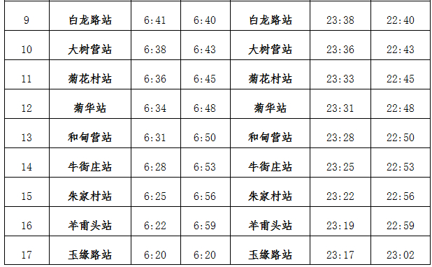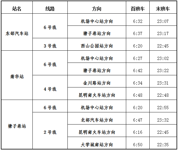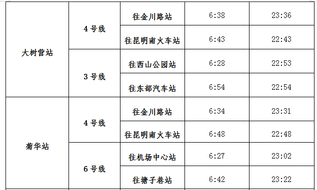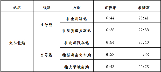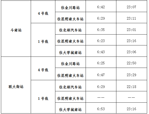 4号线:6:20—22:45(其中:金川路站往昆明南火车站方向为6:20—22:20,昆明南火车站往金川路站方向为6:20—22:45)。