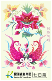 该票面为本次推出的七日卡票面,来源于昆明地铁首届票卡设计大赛,选取云南少数民族刺绣元素,鲜艳的色彩、传统的图案,彰显了别具一格的云南民族文化特色。