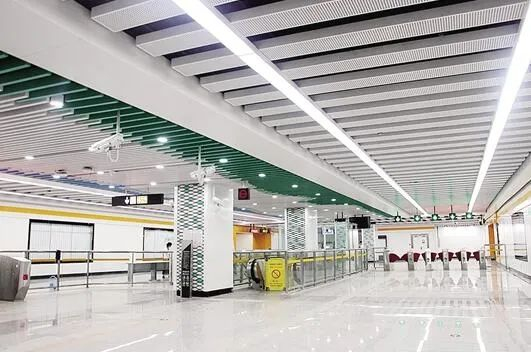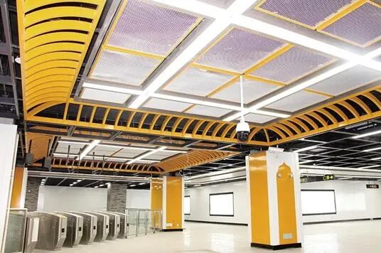 设计思路:天花采用铝合金平板设计成工字钢梁交叉构造,形成米轨桥梁钢架造型,柱面采用烤瓷铝板设计成“工”字钢立柱,细节配以螺栓固定,使整个车站具有工业、粗犷的感觉。