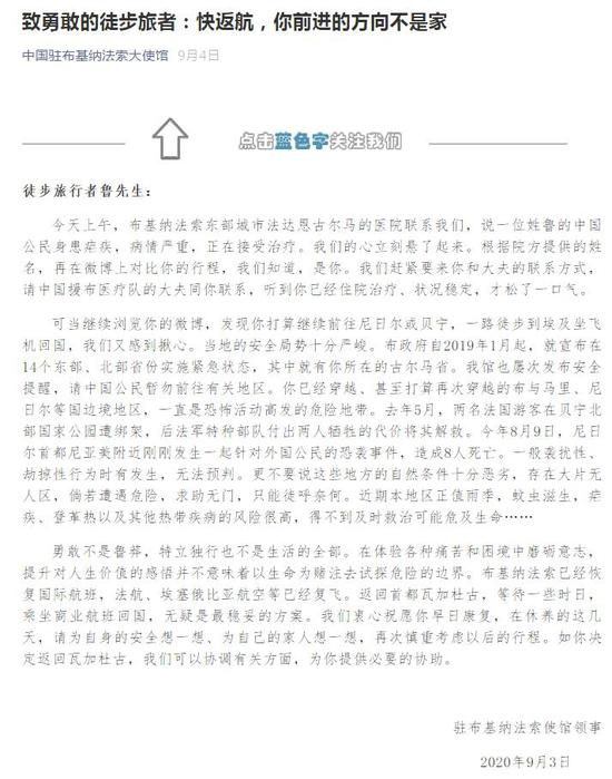 驻布基纳法索大使馆发文的时候其实比较晚了,那时我的疟疾已经治得差不多了。所以“领事直通车”发文前可能没有打电话问布基纳法索的同事。他们确实提供了咨询服务,但发文前没再确认下情况。“领事直通车”这篇文将我和驻布基纳法索大使馆的关系扯到对立面上,我当时也比较生气,回应得也比较激烈,其中确实措辞不当,我也承认错误。