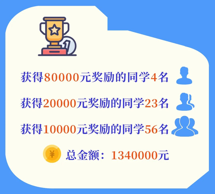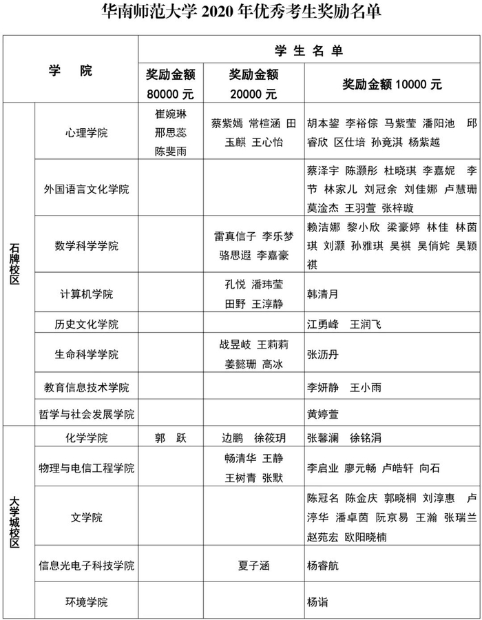 根据《华南师范大学普通高考优秀考生奖励办法(试行)》(华师〔2019〕99号)的规定,学校决定对在2020年普通高考招生录取中报考我校本科各专业的优秀考生给予现金奖励,其中获得80000元奖励的同学4名,获得20000元奖励的同学23名,获得10000元奖励的同学56名。