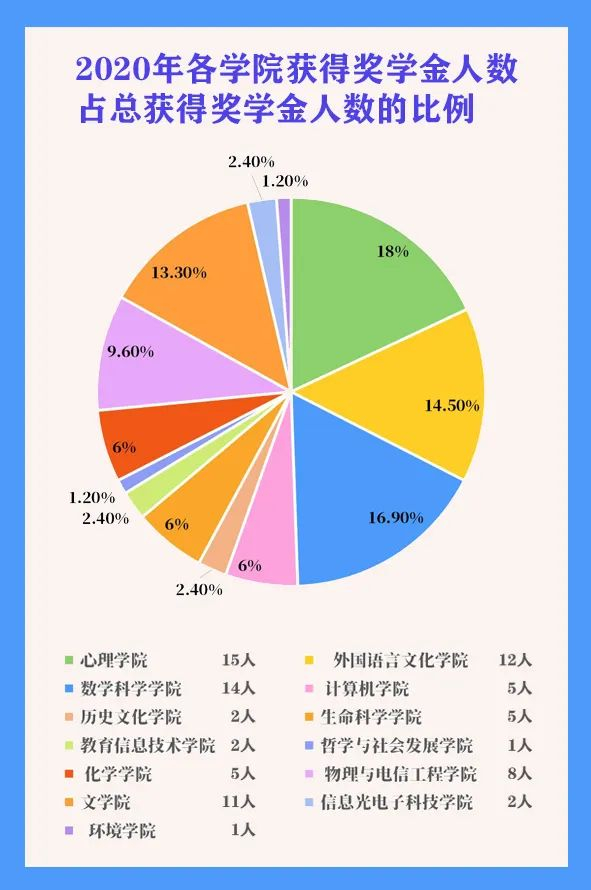 在获奖的考生中,心理学院的小伙伴数量最多,占总获奖人员的18%,数学科学学院则紧随其后。