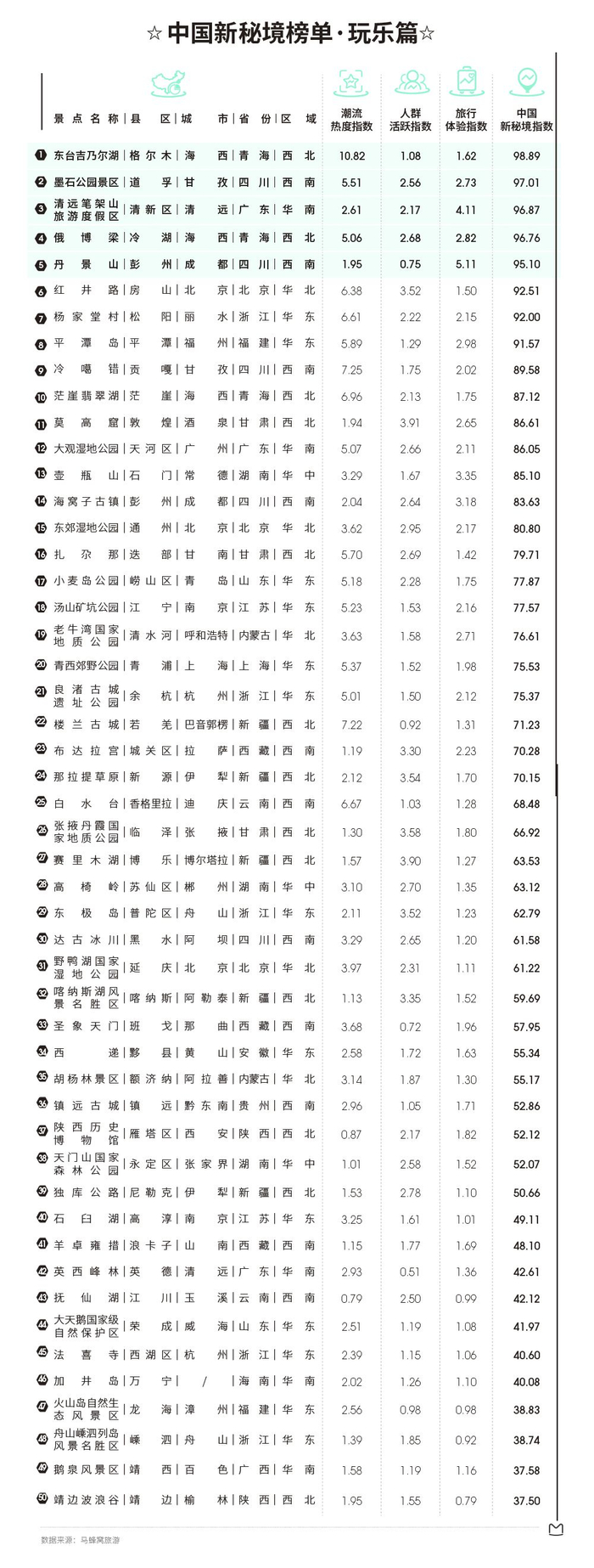 马蜂窝旅游最新发布的《“后疫情时代”攻略:发现中国新秘境》显示,一众曾被忽略的“诗和远方”,终于在后疫情时代被发现。而随着国内上升趋势最强劲、最具新网红气质的50个城市和50个景区景点被发掘、探访,线上资产释放出产业红利,推动目的地和景区可持续发展。
