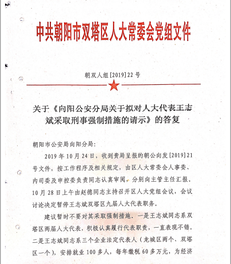 2019年10月28日,双塔区人大常委会作出朝双人组[2019]22号党组文件答复称,当日,区人大召开党组会议,会议讨论决定暂停王志斌双塔区九届人大代表职务。