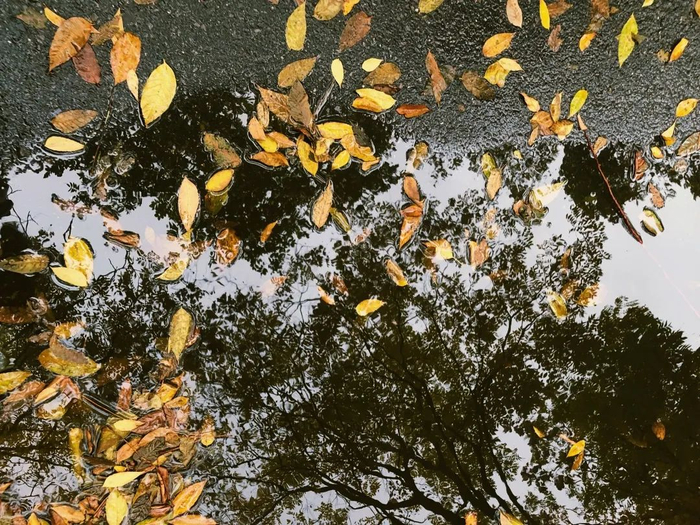 落叶漂浮在路边的水洼里