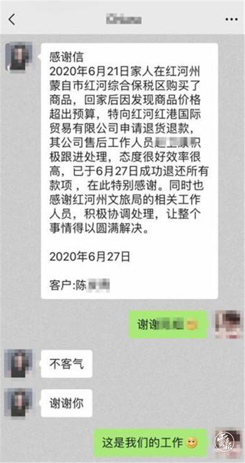 19时46分:退货监理中心工作人员通过“游云南”APP平台与侯先生取得联系,告知退货邮寄等事宜。