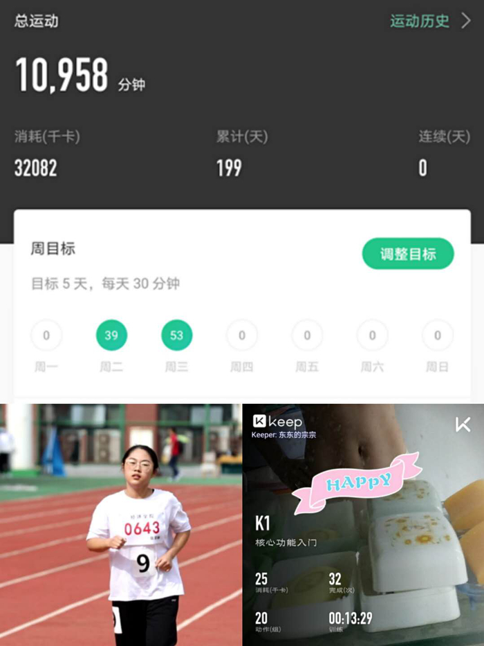 张宗林说:“大家早晨都在睡觉,被窝又那么暖和,诱惑很大。但是运动一定要坚持,清早比别人早起一个小时,又没有浪费时间,又在运动中得到了锻炼。每天看Keep上自己多消耗了几百卡,想到又能多吃一碗饭,就有了坚持的动力。”