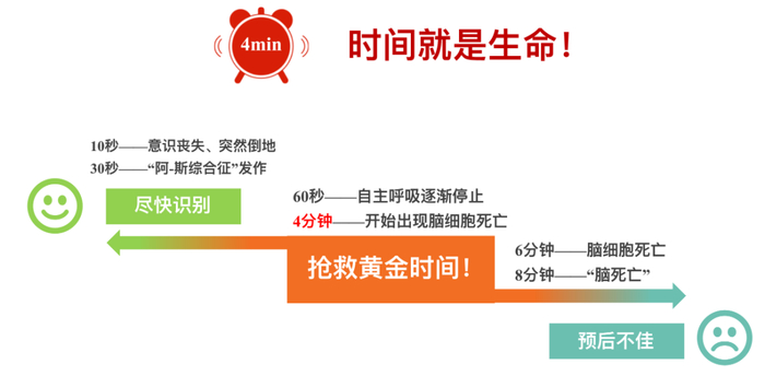 医学上认为,要抢救医院外心脏猝死者,唯一的救治手段是胸外按压+心脏除颤,现代医学证明,猝死患者抢救的最佳时间是2分钟,2分钟内心肺复苏的生存率可达90%,4分钟内心肺复苏的生存率约50%,在10 分钟后抢救成功率几乎为0。