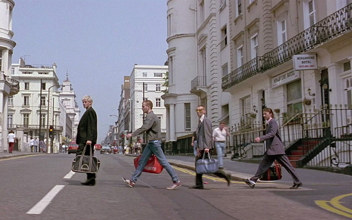 电影《猜火车》讲述了英国底层的几个年轻人的故事,披头士也曾是上世纪60年代年轻人们的偶像,所以片中有多处致敬。比如主角几人穿过马路走进旅馆的场景就是对《Abbey Road》封面的致敬。