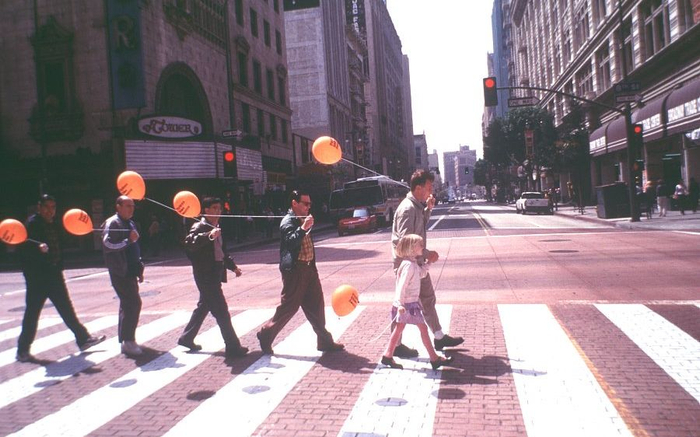 电影《我是山姆》讲述了智力只有7岁的男主角和女儿露西相依为命,在面临失去抚养权时,在各路朋友的帮助下与女儿团聚的故事。山姆和露西,还有一众朋友,排队穿过人行横道的画面神似《Abbey Road》。